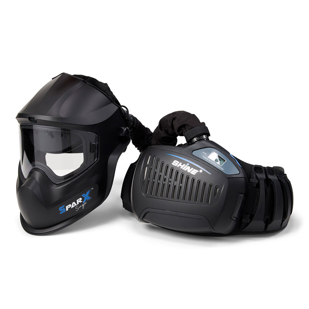 Flip-up welding and grinding helmet with auto-darkening True Color filter in optical class 1/1/1/1 and integrated fresh air system.